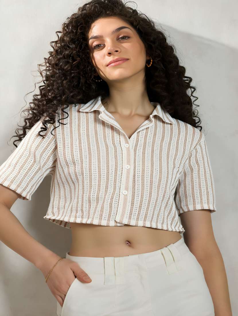 - » women striped collared short sleeve crop shirt