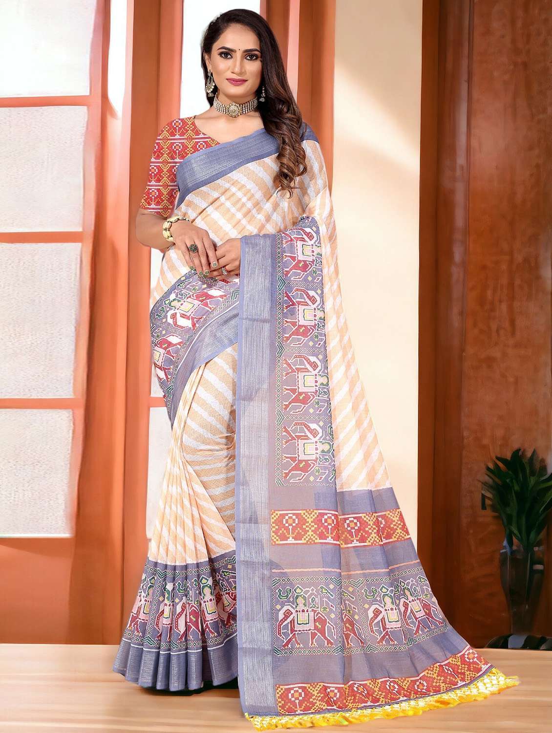 - » beige striped printed saree with blouse