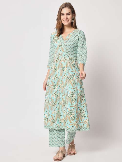 - » women sea green floral printed kurta palazzo set