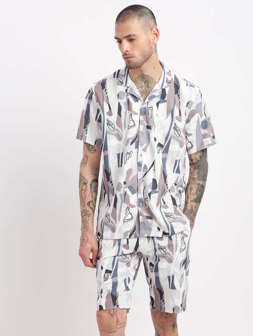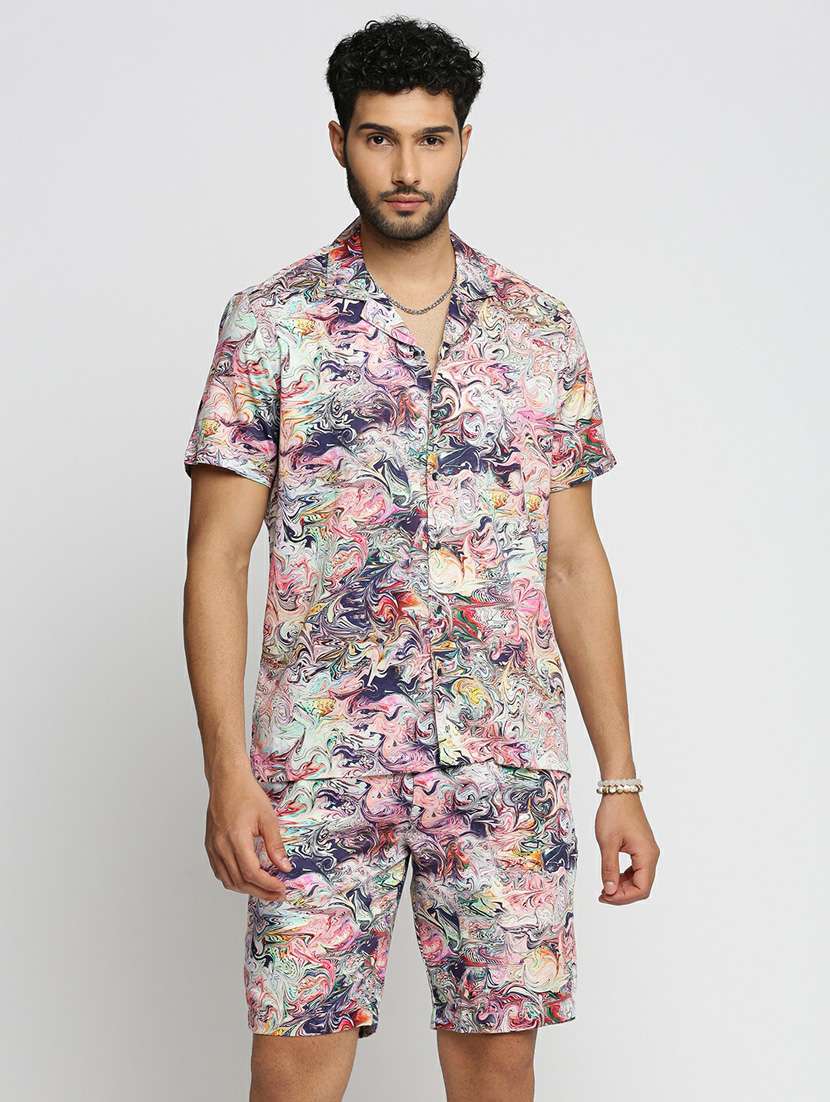 SHOWOFF Men's Short Sleeves Printed Cuban Collar Over Sized Multi Co-Ords Set
