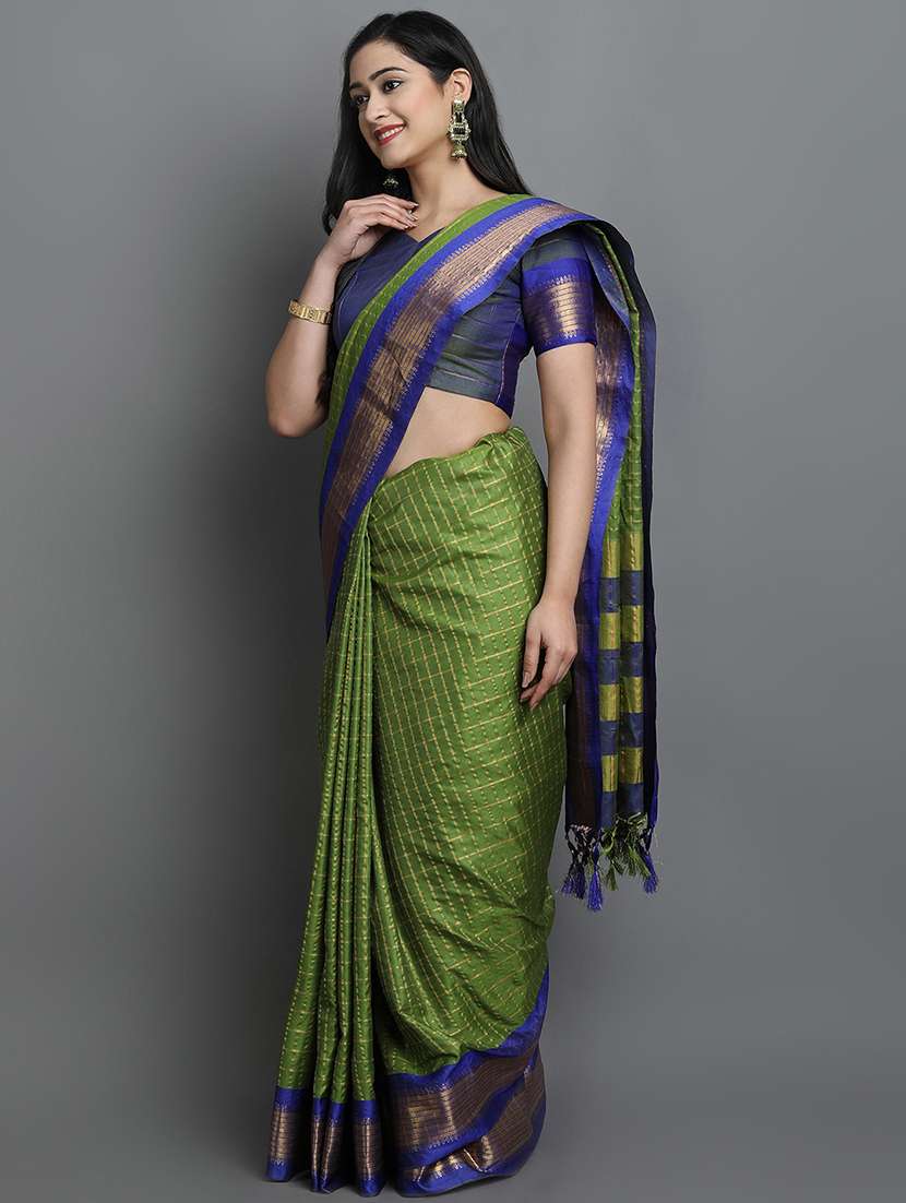 Saree Details :- Type of Saree: Traditional Silk Saree Fabric: Lightweight and lustrous silk fabric, offering a refined and elegant finish. Pattern:- Body: Subtle golden base with fine diagonal line patterns, providing a textured and graceful appearance. Border: Contrasting dark black border with gold zari detailing for a traditional look. Pallu: Features a broad dark black pallu adorned with golden zari lines and tasseled ends, adding charm and elegance. Blouse: Comes with a matching unstitched blouse piece in dark black and gold zari accents, enhancing the saree’s aesthetic. Design Aesthetic: Perfectly balances tradition with sophistication, making it ideal for weddings, festive occasions, or formal events. This saree exudes timeless elegance with its intricate patterns and vibrant color contrasts, making it a must-have for any saree enthusiast.