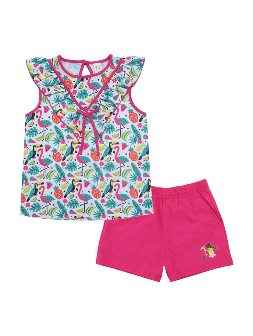 - » girls quirky printed round neck ruffled shorts set