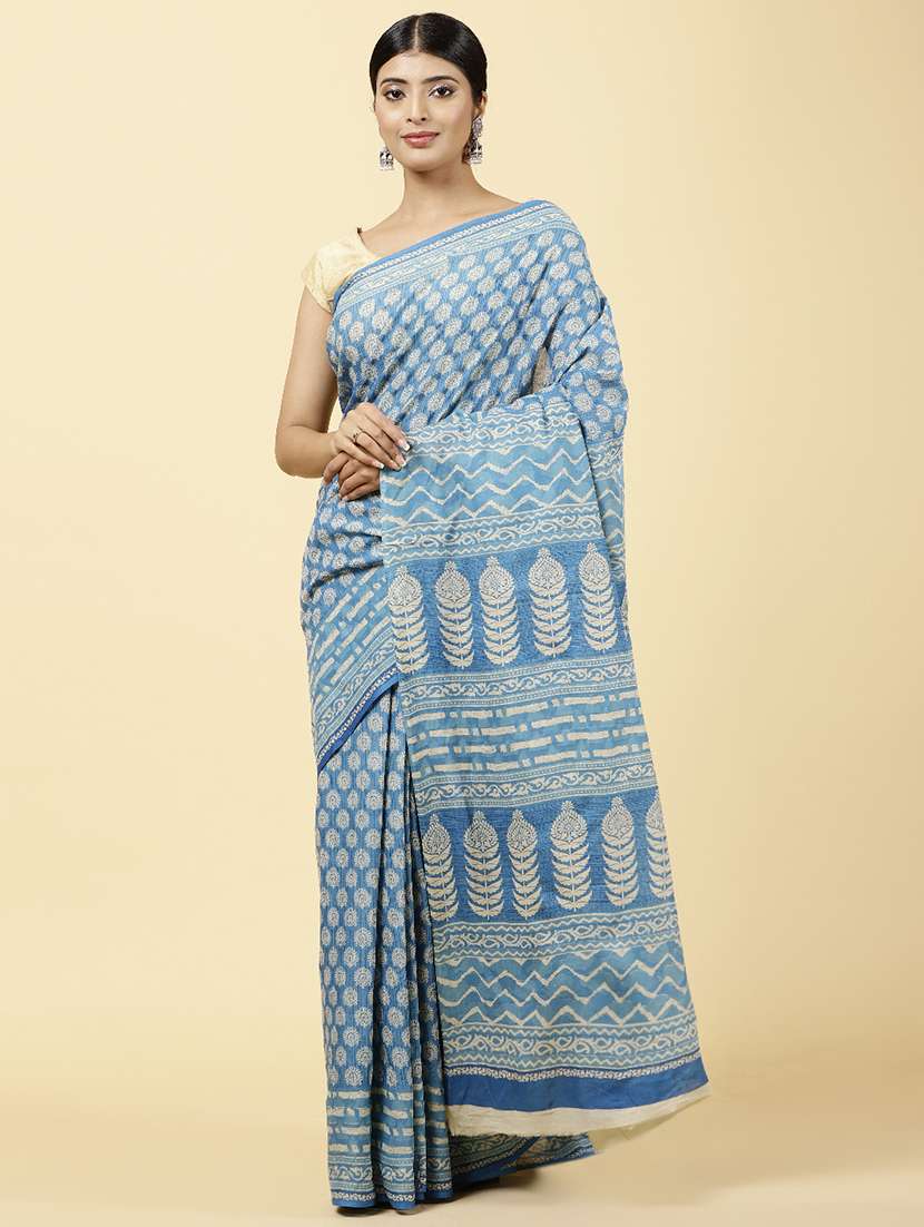 turquoise colored printed saree with blouse