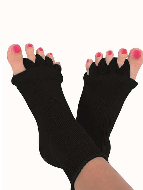Package Contents: Foot Alignment Socks I Material: Cotton I Color: Black I Size: Free Size I anti-bacterial, anti-slip, breathable, stretchable, and sweat absorbent I Simply wear these socks that separate toes while you are relaxing or sleeping for much-needed foot stress relief I Ideal after a hectic day or wearing high heels, for barefoot activities like Barre, Pilates, Yoga, and Dance, or during gym workouts or sports to alleviate foot or knee cramps.