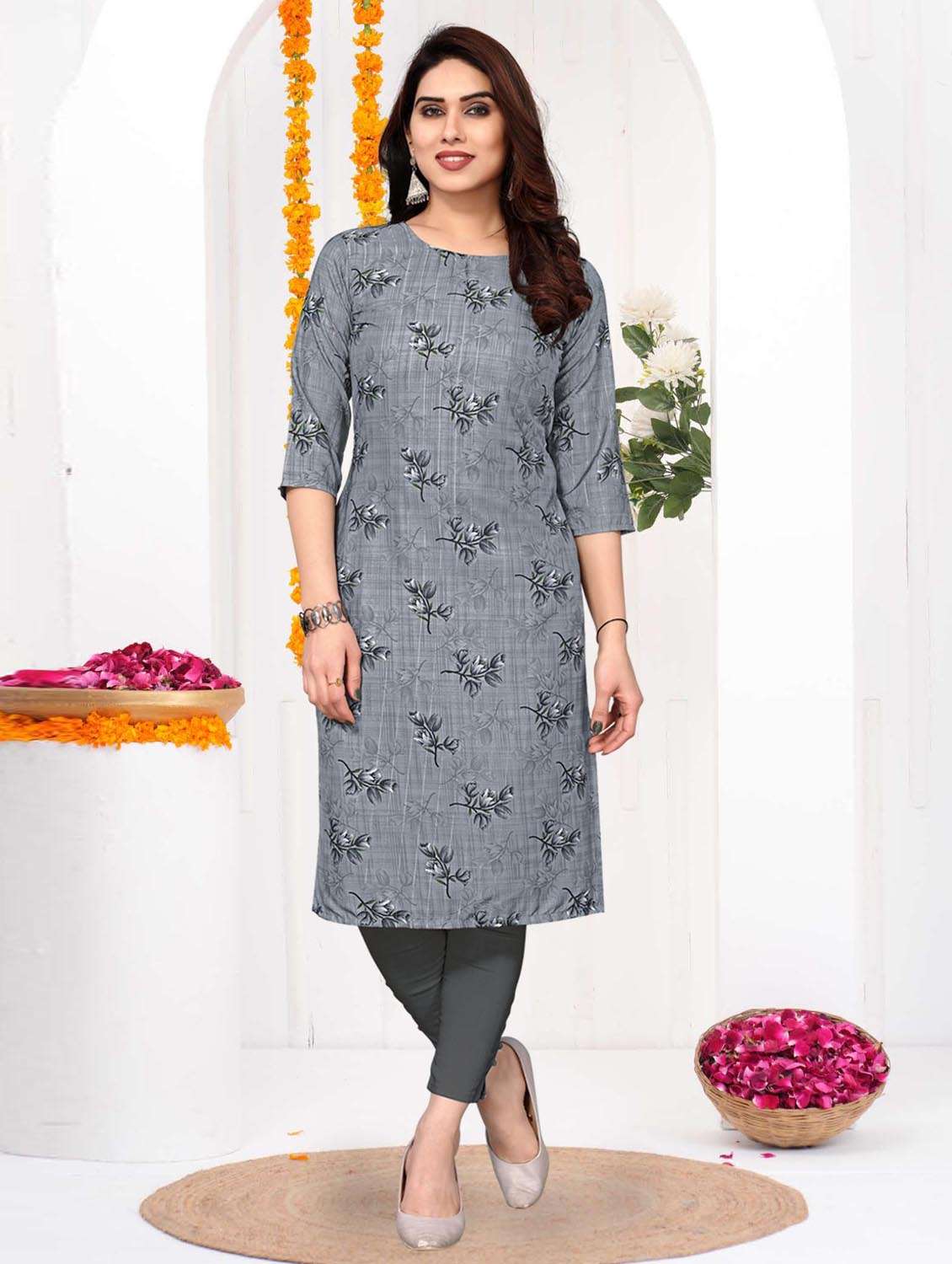 women printed three quarter sleeve straight kurta