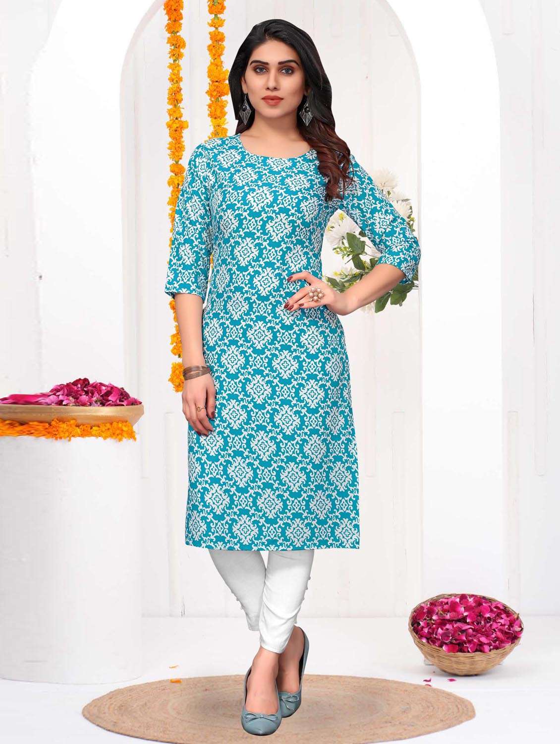 women printed three quarter sleeve straight kurta