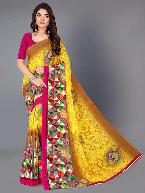 women yellow printed georgette saree with blouse - 21432094 - Very Small Image - 1