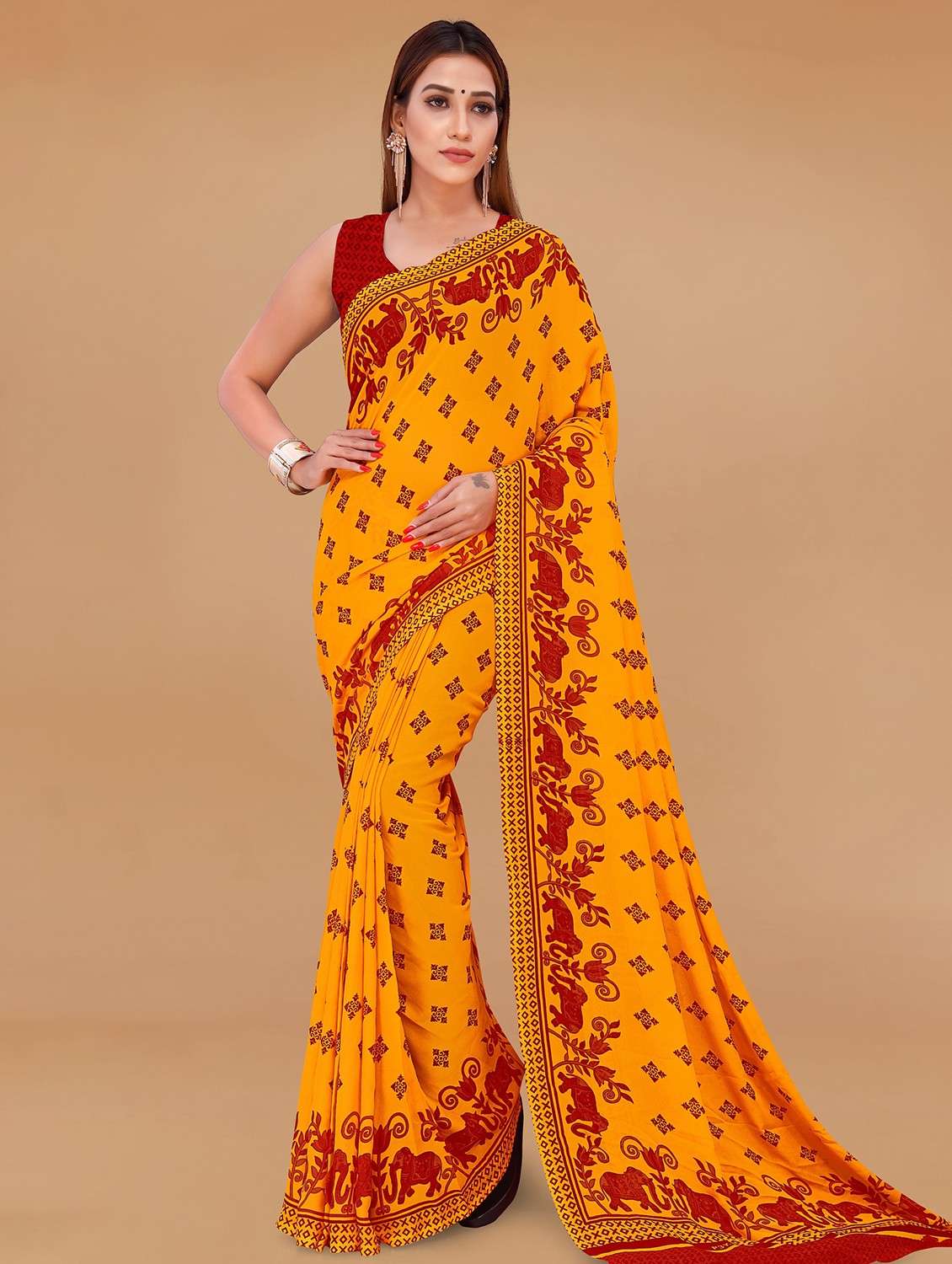 women yellow printed saree with blouse