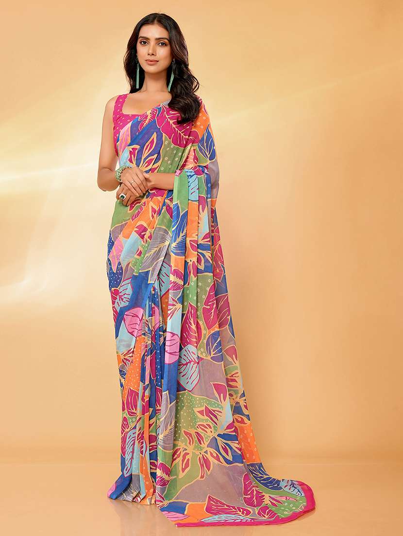 Embrace a relaxed yet stylish vibe with this multicolored georgette saree, featuring vibrant tropical floral prints. The lightweight and breezy fabric makes it ideal for casual outings, offering both comfort and elegance. Its playful multicolored design adds a refreshing pop of color to your wardrobe, making it a perfect choice for daytime events. Pair it with minimal accessories for a chic, effortless look.
