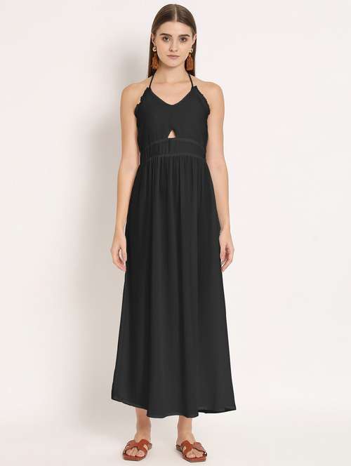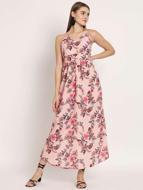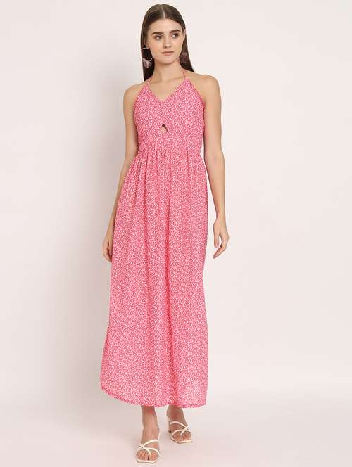 *Includes: This Clothing Consists Of 1 Dress (Any Accessories Worn By The Model Are Not For Sale)*Material: Moss Georgette Gsm: 131*Dress Length: 55 Inches (Approx.)*Model Stats: The Model In The Image Is 178 Cm Tall, And Bust 34\ Inches Is Wearing Size - (S) Small*Features: Sleeveless, Strap Shoulders, Front Cut Out, V-Neck, Maxi Length, Front, Lightweight, All Over Printed Pattern. *Care: Machine Wash Dry, Tumble Wash Low, Remove Promptly*Size Information: Please Refer To Our Size Chart Before Making The Purchase. If Your Size Is In Between Two Sizes, We Recommend That You Choose A Larger Size.*Tags: Printed Dress For Women, Halter Dresses For Women, Ruffle Dress, V-Neck Casual Dress, Resort Wear For Women, Dresses For Women 2023 Casual, Casual Wear, Resort Wear