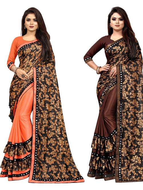 This Multi Color Combo offer Saree has printed Frill and Sequence Lace Border. We offer High Quality Range of Printed Sarees that is Designed by our team of Creative Professionals and at the same time perfect mix of modern patterns and contemporary designs of ethnic collection. This saree is crafted with Lycra fabric, which is further enriched with beautiful Floral prints that makes you look awesome and stunningly beautiful in this lovely half & half sari that is decorated with intricately printed Lycra Ruffles/Frill. Matching unstitched Banglory Silk Blouse Piece, which can be stitched as per your choice & requirement that add the glam. There might be color variation due to screen resolution and digital photography. This sari is an ideal for Occasions like casual, traditional, party wear, festival, wedding.
