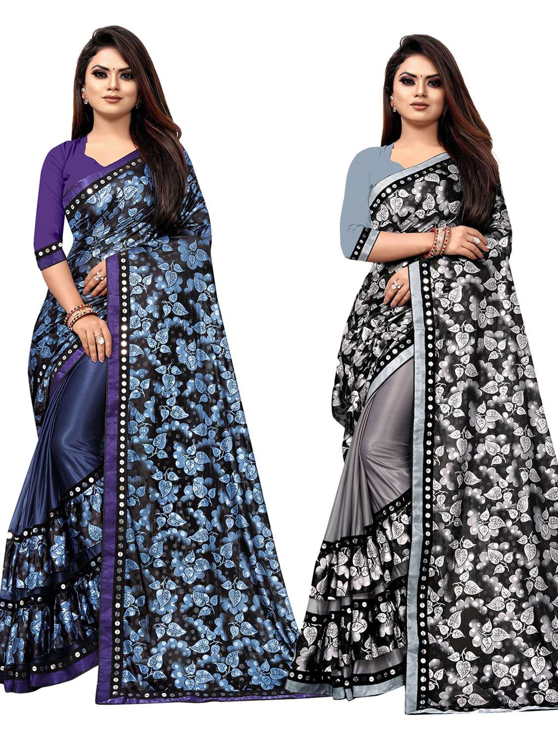 This Multi Color Combo offer Saree has printed Frill and Sequence Lace Border. We offer High Quality Range of Printed Sarees that is Designed by our team of Creative Professionals and at the same time perfect mix of modern patterns and contemporary designs of ethnic collection. This saree is crafted with Lycra fabric, which is further enriched with beautiful Floral prints that makes you look awesome and stunningly beautiful in this lovely half & half sari that is decorated with intricately printed Lycra Ruffles/Frill. Matching unstitched Banglory Silk Blouse Piece, which can be stitched as per your choice & requirement that add the glam. There might be color variation due to screen resolution and digital photography. This sari is an ideal for Occasions like casual, traditional, party wear, festival, wedding.