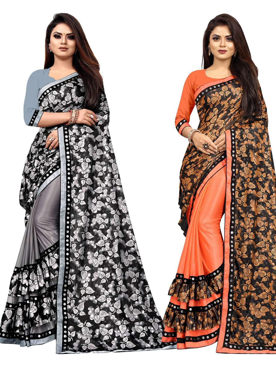 This Multi Color Combo offer Saree has printed Frill and Sequence Lace Border. We offer High Quality Range of Printed Sarees that is Designed by our team of Creative Professionals and at the same time perfect mix of modern patterns and contemporary designs of ethnic collection. This saree is crafted with Lycra fabric, which is further enriched with beautiful Floral prints that makes you look awesome and stunningly beautiful in this lovely half & half sari that is decorated with intricately printed Lycra Ruffles/Frill. Matching unstitched Banglory Silk Blouse Piece, which can be stitched as per your choice & requirement that add the glam. There might be color variation due to screen resolution and digital photography. This sari is an ideal for Occasions like casual, traditional, party wear, festival, wedding.