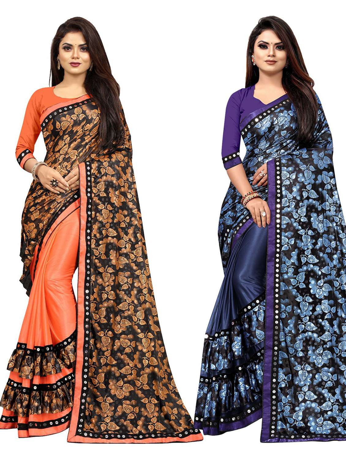 This Multi Color Combo offer Saree has printed Frill and Sequence Lace Border. We offer High Quality Range of Printed Sarees that is Designed by our team of Creative Professionals and at the same time perfect mix of modern patterns and contemporary designs of ethnic collection. This saree is crafted with Lycra fabric, which is further enriched with beautiful Floral prints that makes you look awesome and stunningly beautiful in this lovely half & half sari that is decorated with intricately printed Lycra Ruffles/Frill. Matching unstitched Banglory Silk Blouse Piece, which can be stitched as per your choice & requirement that add the glam. There might be color variation due to screen resolution and digital photography. This sari is an ideal for Occasions like casual, traditional, party wear, festival, wedding.