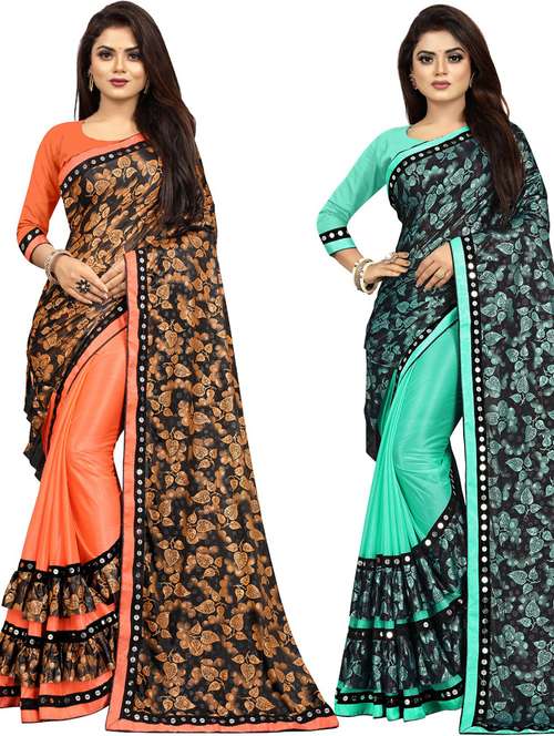 This Multi Color Combo offer Saree has printed Frill and Sequence Lace Border. We offer High Quality Range of Printed Sarees that is Designed by our team of Creative Professionals and at the same time perfect mix of modern patterns and contemporary designs of ethnic collection. This saree is crafted with Lycra fabric, which is further enriched with beautiful Floral prints that makes you look awesome and stunningly beautiful in this lovely half & half sari that is decorated with intricately printed Lycra Ruffles/Frill. Matching unstitched Banglory Silk Blouse Piece, which can be stitched as per your choice & requirement that add the glam. There might be color variation due to screen resolution and digital photography. This sari is an ideal for Occasions like casual, traditional, party wear, festival, wedding.