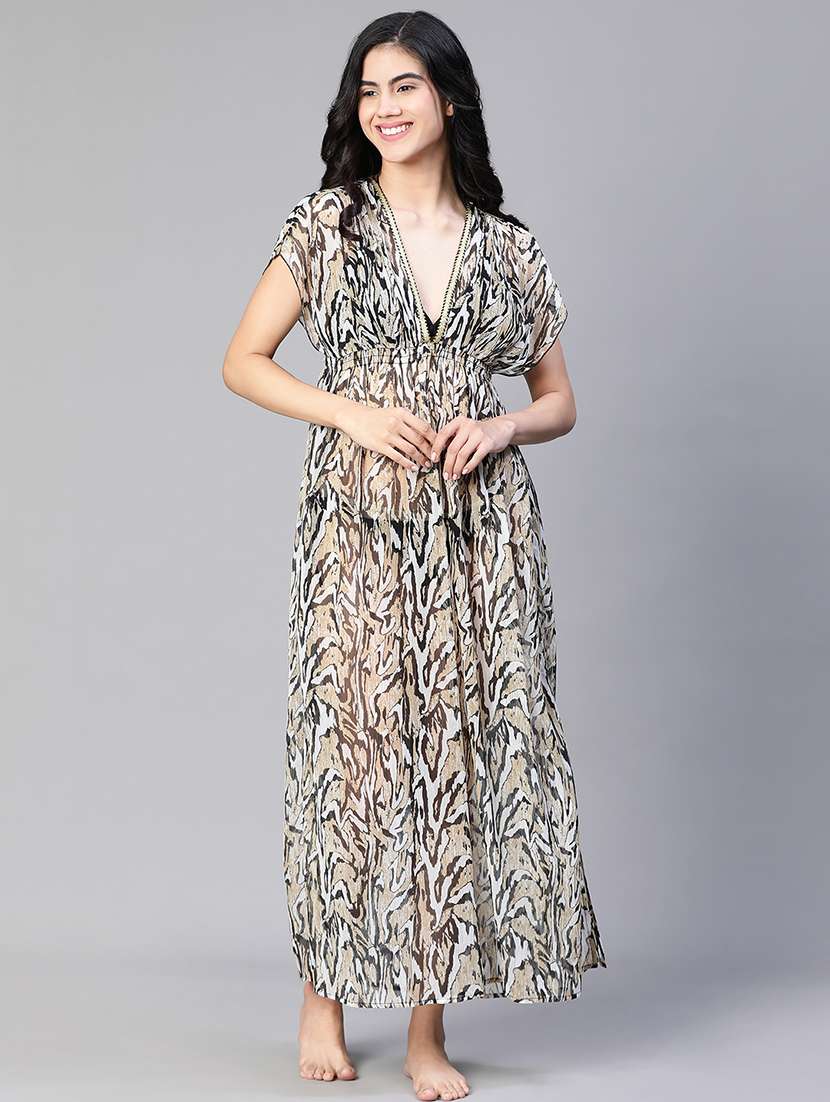 Looking for a hot jazzy dress for your next beach vacation Then this Fortuned floral print laced & elasticatedwomen's beachwear slit maxi dress is a pick for you. Made with polyester fabric, it features an all-over print, v-neckline decked up with golden lace, short sleeves, elasticatedwaist flared long hem along with a slit on the side. Style it with a cool bikini inside and beachwear accessories like a hat, and sunshades and click fabulous beachwear pictures.