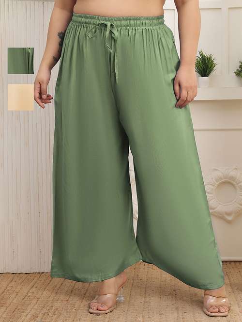 Upgrade your collection of warm-weather staples with these Beige and Pista Green Plus Palazzo Combo by Valles365. Pair them with a flowy tee and lace-up sandals for a super chic look.