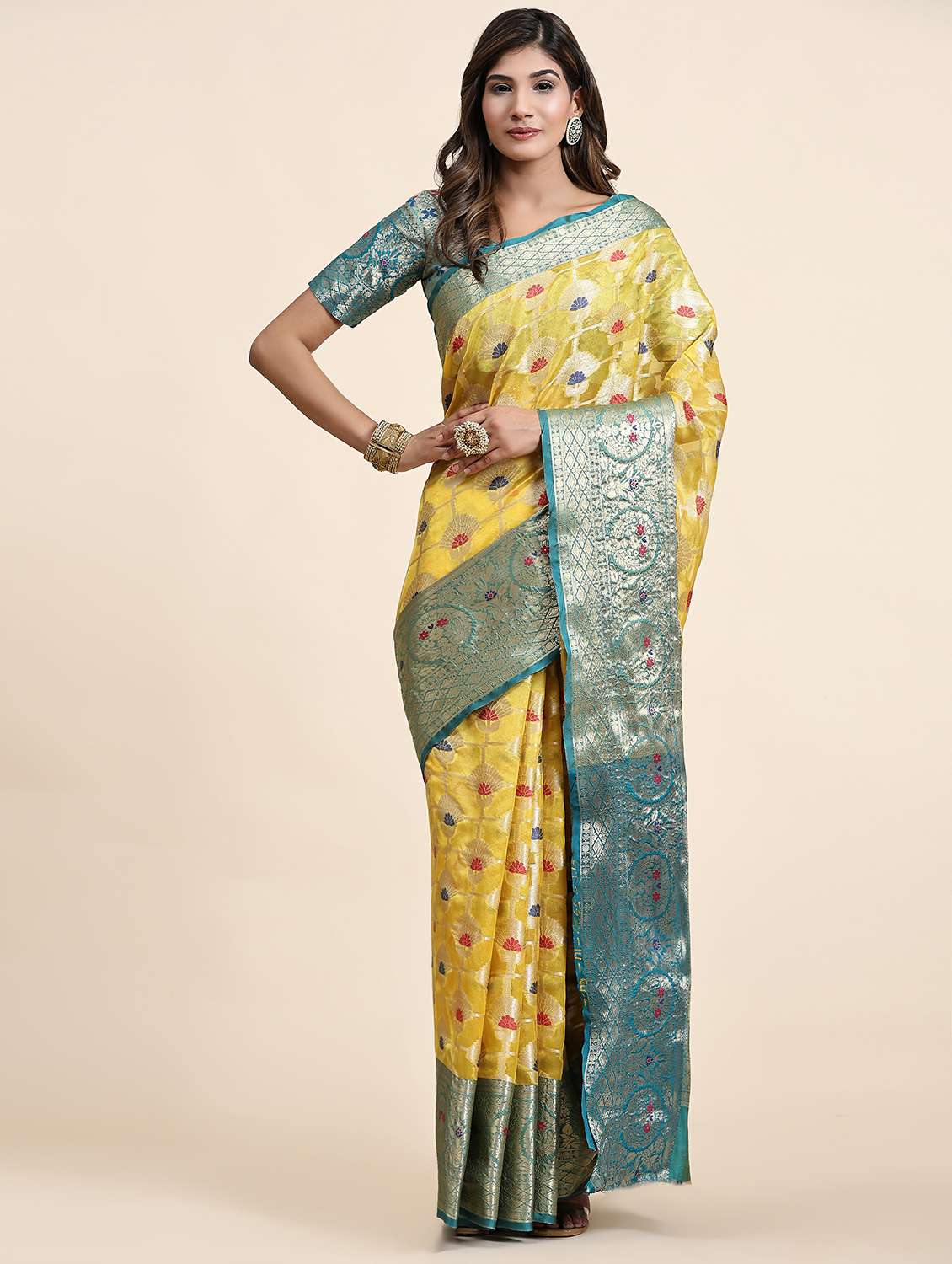 yellow self design banarasi saree with blouse