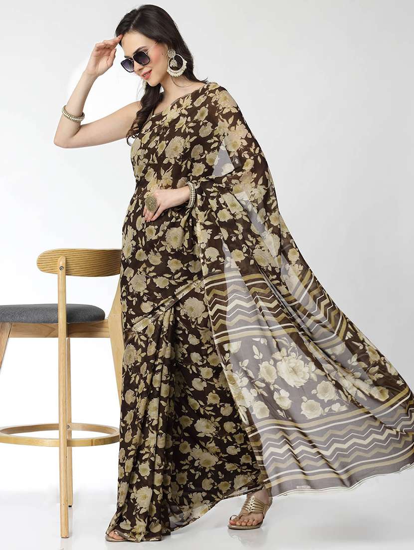 - » women brown floral printed saree with blouse