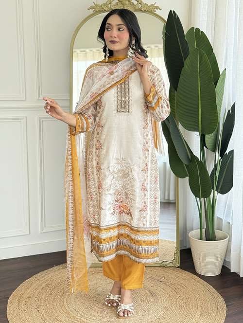 - Find gorgeous sets of ethnic wears in trending designs in cream colors suitable for festive wear of occasions.