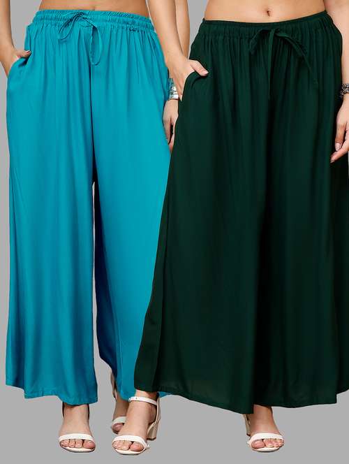 Upgrade your collection of warm-weather staples with these top-notch Turquoise Blue and Dark Green Plus pocket palazzos combo's by Valles365. Pair them with a flowy tee and lace-up sandals for a super chic look.