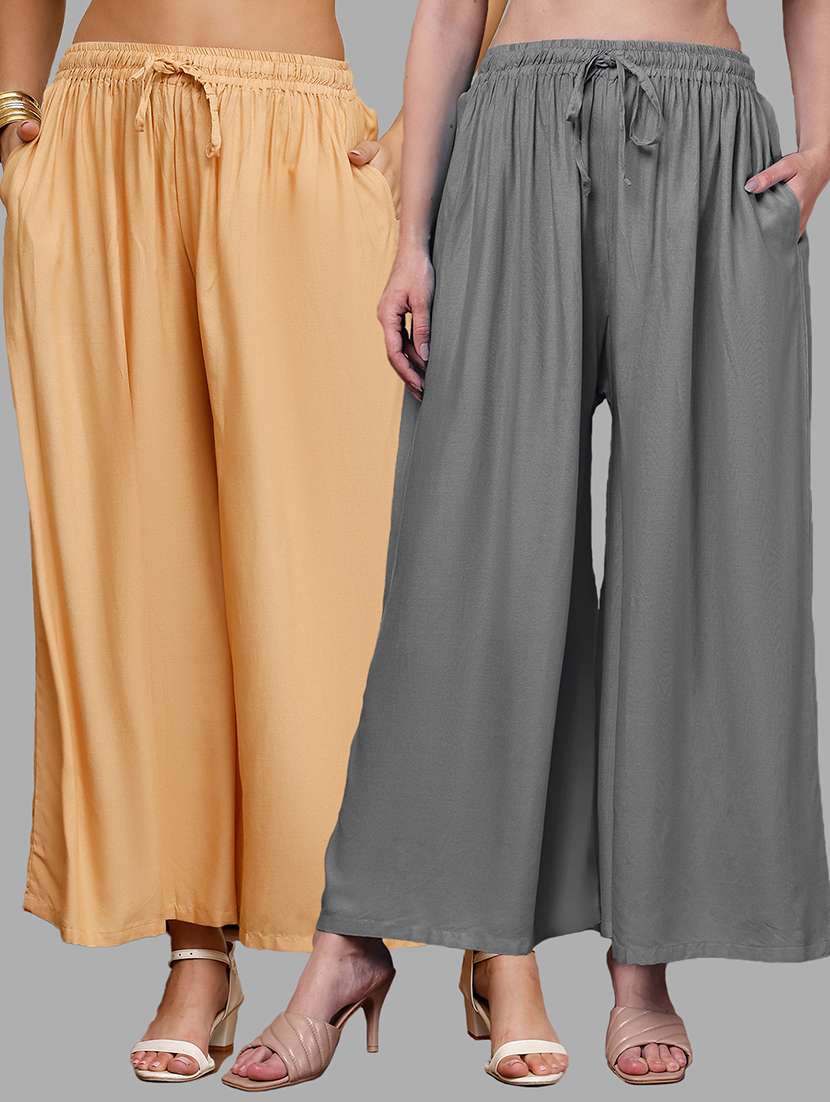 Upgrade your collection of warm-weather staples with these top-notch Grey and Beige Plus Pocket Palazzos combo's by Valles365. Pair them with a flowy tee and lace-up sandals for a super chic look.