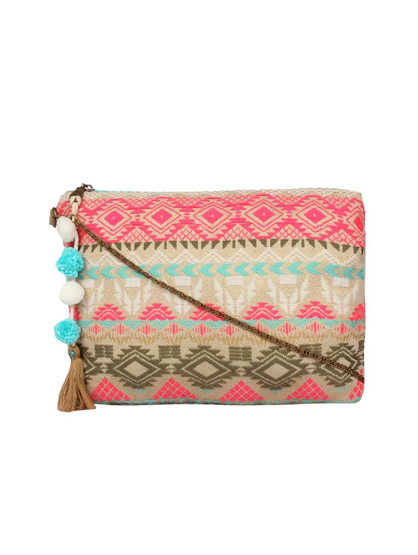 Carry This Anekaant Raster Multi Cotton Woven Jacquard Sling Bag with front tassel to your next brunch outing. One compartment . One zip pocket inside . It has long detachable metal chain and can be used as clutch also .