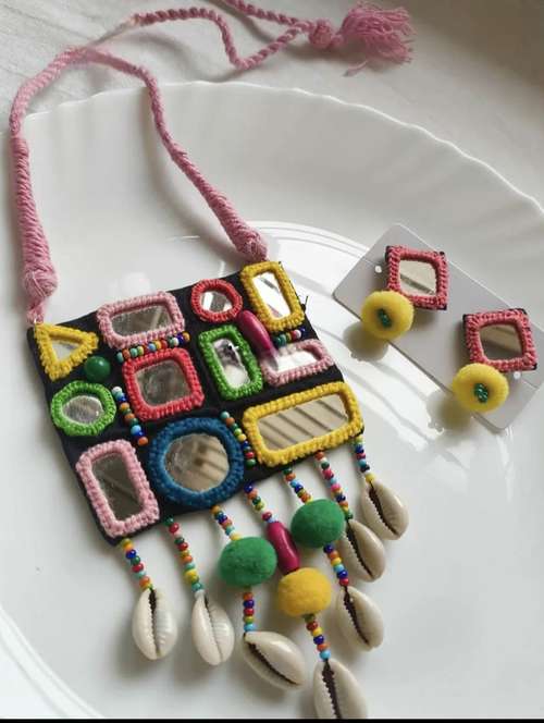 Add a splash of tradition and vibrant charm to your festive outfit with this Multicolor Handcrafted Choker Necklace and Earring Set from Bajana Lifestyle. Featuring hand-embroidered mirror work, colorful thread detailing, and natural cowrie shells, this set is perfect for completing your Navratri, Dandiya, or Garba look.
