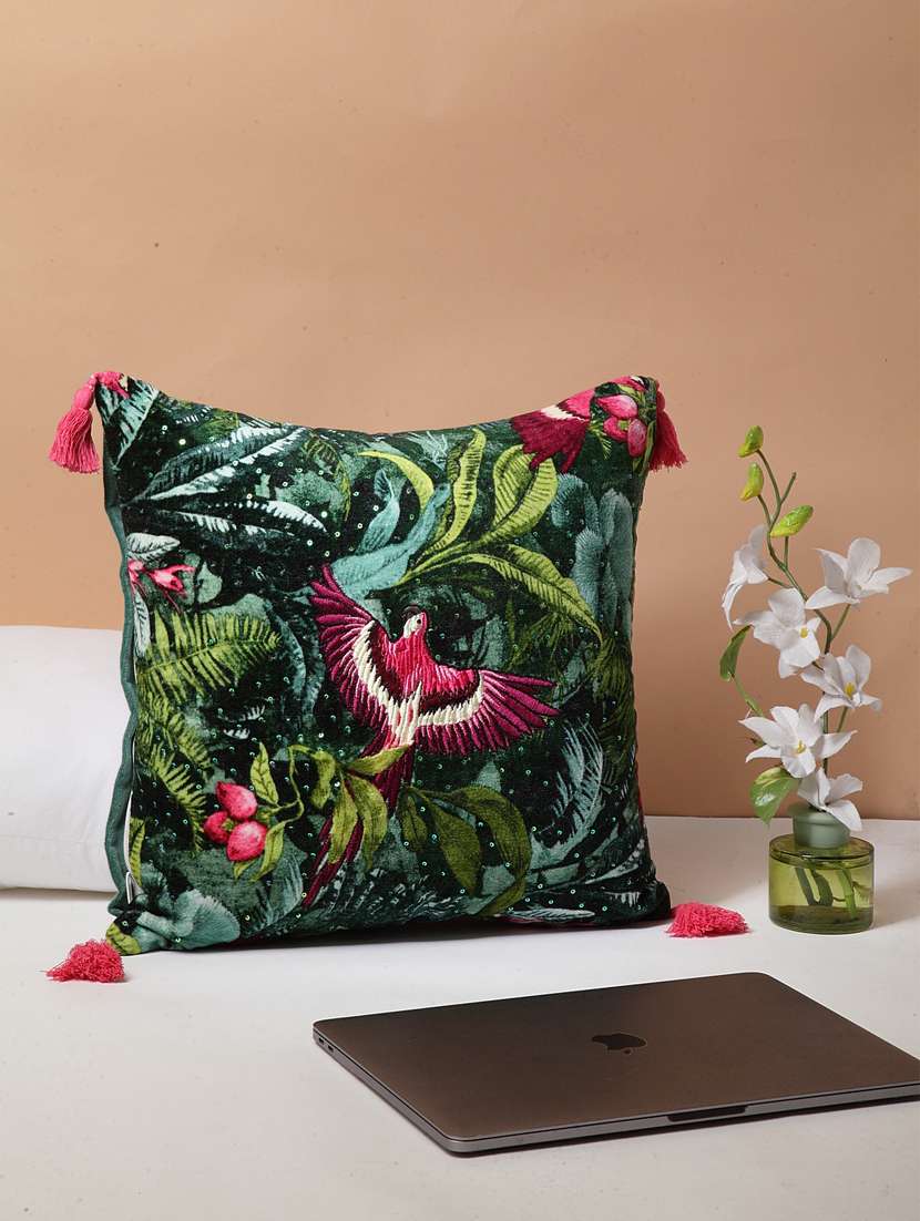 blanc9 digitally printed square velvet embroidered cushion cover with tassels 16x16inches