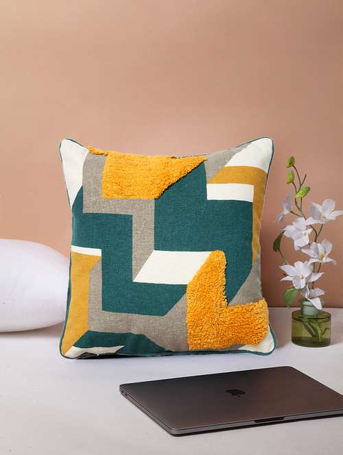- » blanc9 cotton peacock blue geometric print tufted cushion cover 16 x16 inches