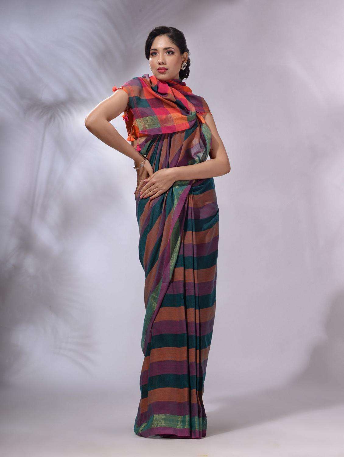 Look glamorous and alluring in this red matka silk handwoven saree. It has plain all over with zari and the borders have geometric patterns.