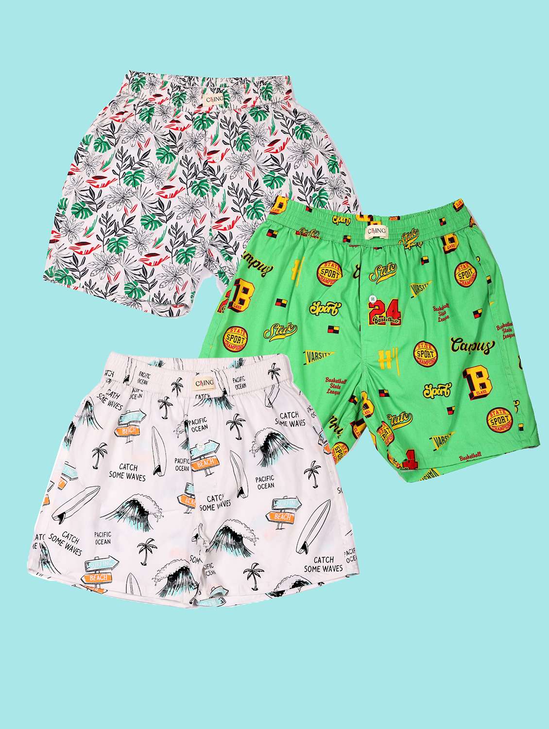 Keep your little one cool, comfy, and stylish with this Pack of 3 Boys Cotton Printed Boxer Shorts. Crafted from soft and breathable cotton fabric, these kids boxer shorts are gentle on the skin and perfect for everyday wear. Featuring fun and vibrant prints, they’re ideal as boys innerwear shorts, sleepwear, or casual lounge shorts. The elastic waistband ensures a snug fit, while the relaxed design gives freedom of movement all day long. Whether it's a fun day at home or bedtime, these multicolor boys boxer shorts are a must-have in every kid's wardrobe.