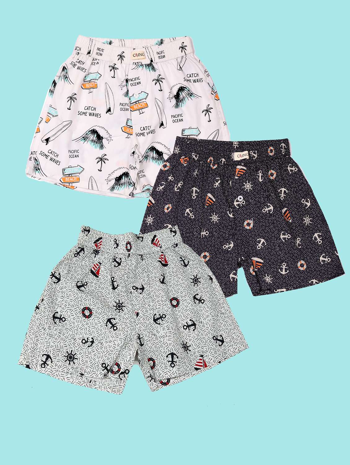 Keep your little one cool, comfy, and stylish with this Pack of 3 Boys Cotton Printed Boxer Shorts. Crafted from soft and breathable cotton fabric, these kids boxer shorts are gentle on the skin and perfect for everyday wear. Featuring fun and vibrant prints, they’re ideal as boys innerwear shorts, sleepwear, or casual lounge shorts. The elastic waistband ensures a snug fit, while the relaxed design gives freedom of movement all day long. Whether it's a fun day at home or bedtime, these multicolor boys boxer shorts are a must-have in every kid's wardrobe.