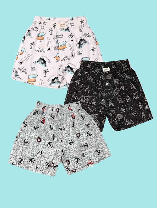 Keep your little one cool, comfy, and stylish with this Pack of 3 Boys Cotton Printed Boxer Shorts. Crafted from soft and breathable cotton fabric, these kids boxer shorts are gentle on the skin and perfect for everyday wear. Featuring fun and vibrant prints, they’re ideal as boys innerwear shorts, sleepwear, or casual lounge shorts. The elastic waistband ensures a snug fit, while the relaxed design gives freedom of movement all day long. Whether it's a fun day at home or bedtime, these multicolor boys boxer shorts are a must-have in every kid's wardrobe.
