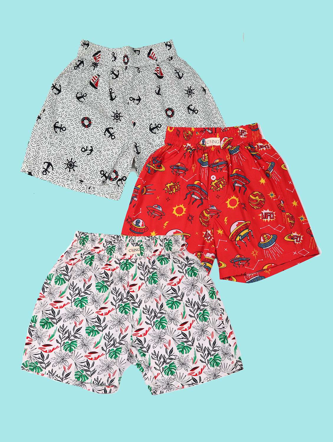 Keep your little one cool, comfy, and stylish with this Pack of 3 Boys Cotton Printed Boxer Shorts. Crafted from soft and breathable cotton fabric, these kids boxer shorts are gentle on the skin and perfect for everyday wear. Featuring fun and vibrant prints, they’re ideal as boys innerwear shorts, sleepwear, or casual lounge shorts. The elastic waistband ensures a snug fit, while the relaxed design gives freedom of movement all day long. Whether it's a fun day at home or bedtime, these multicolor boys boxer shorts are a must-have in every kid's wardrobe.
