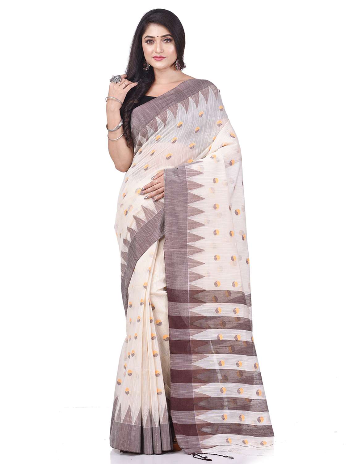 Explore the collection of beautifully Bengal Traditional Tant/Tangail Big Temple Par Handloom Hand Made Soft Khadi Bicolor Ball Temple Par Cotton Saree of West Bengal designed sarees from Desh Bidesh. Each piece is elegantly crafted and will surely add to your wardrobe. Pair this piece with heels or flats for a graceful look. You can wear this saree in all occasions specially Puja, Party and any occasion in your family or friends. The decorative material is Cotton Threads. Its unique color combination and Soft Bengal handloom Cotton tant saree The Elegant Class saree has comes from the Desh Bidesh. customer satisfaction is the utmost priority . The color may vary due to screen setting . Fabric: Cotton; Length: 6.3 meter Set Content: With Blouse Piece Care Instructions: Dry Clean Only Wash Care : Dry Wash Only, Don’t Bleach