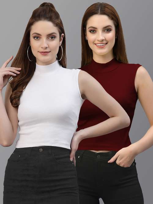 Women White Maroon Solid Casual Knitted cotton Rib Crop top, Has a turtle neck and No sleeve.