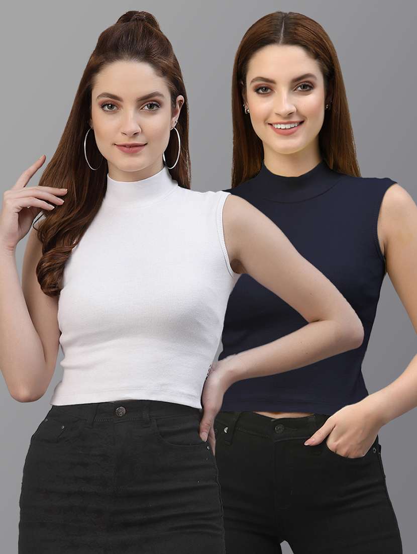 Women White Navy Blue Solid Casual Knitted cotton Rib Crop top, Has a turtle neck and No sleeve.