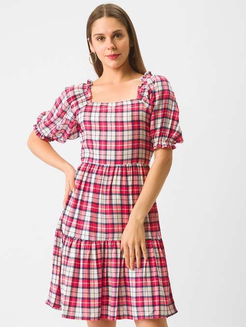 - Dress up in a soothing pattern and don this dress made of cotton material.