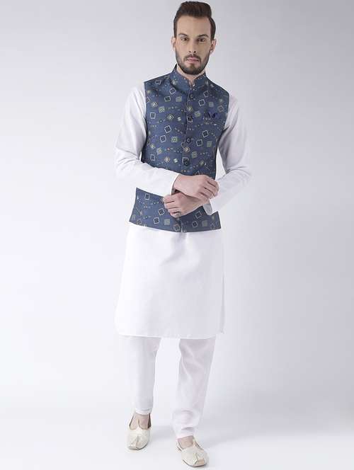 - » white solid kurta pyjama set with blue printed nehru jacket