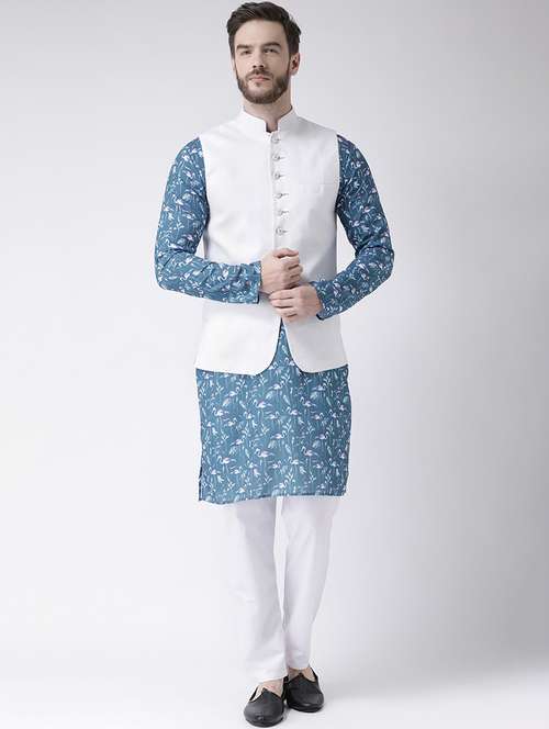 blue printed kurta pyjama set with white solid nehru jacket