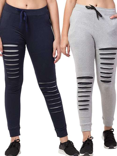 Lesuzaki Pack of 2 Women's Cotton Designer Slim Fit Casual Track Pants/Lowers/Joggers for Women(Light Grey and Navy)