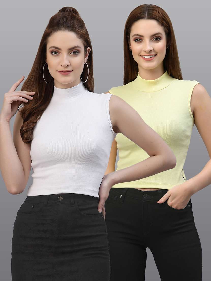 White and Yellow Solid Casual Knitted cotton Rib Crop top, Has a turtle neck and No sleeve.