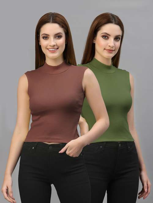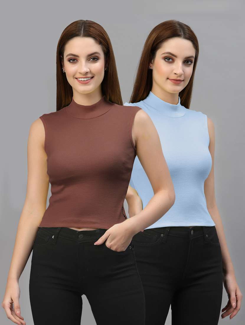 Women Women Brown Turqoise Solid Casual Knitted cotton Rib Crop top, Has a turtle neck and No sleeve.