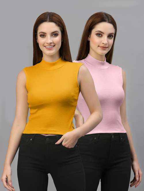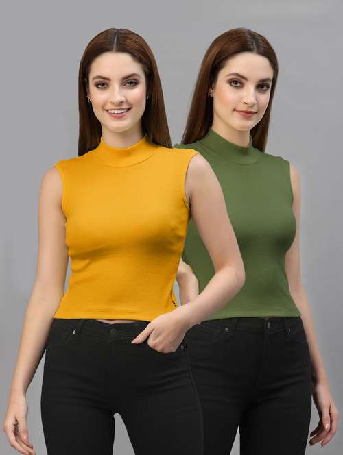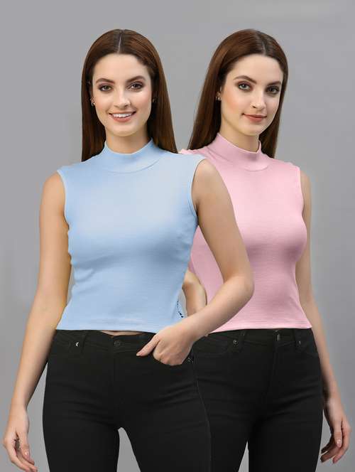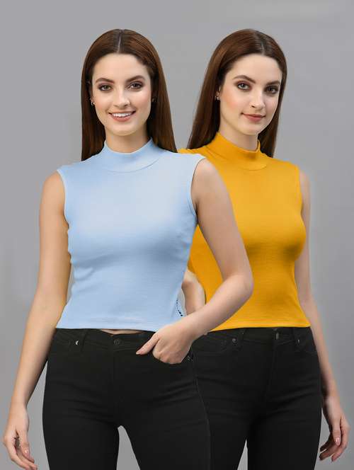 - Opt for this top made up of cotton lycra material and get it in a varied neck design.