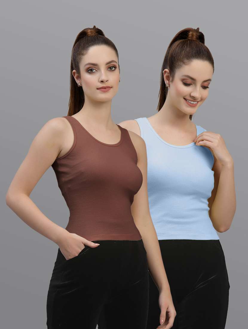 Brown Turquiose Solid Casual Knitted cotton Rib Crop top, Has a round neck and No sleeve.
