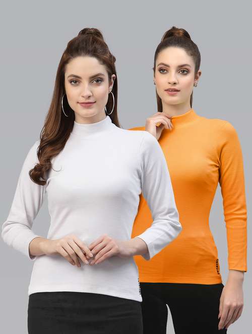 White Orange Solid Casual Knitted cotton Rib Regular Length top for women direct manufectured by Friskers, Has a Turtle neck and Long sleeve.