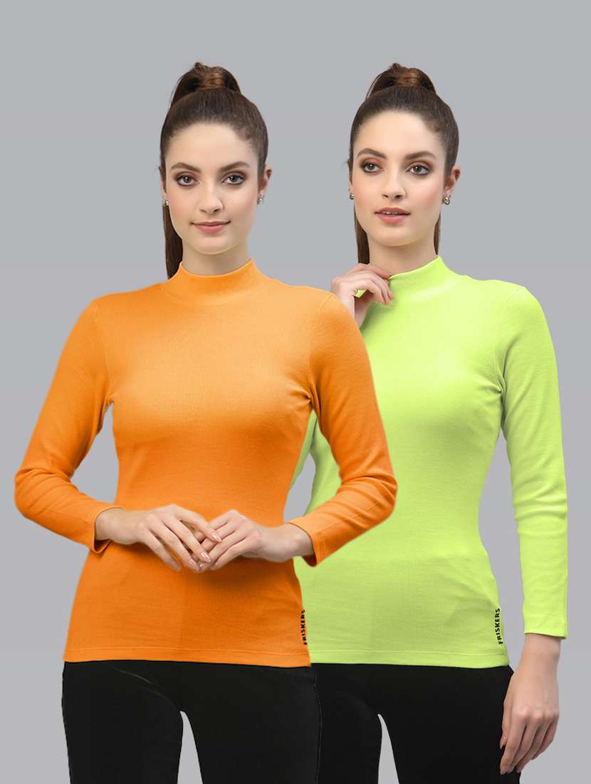Orange Green Solid Casual Knitted cotton Rib Regular Length top for women direct manufectured by Friskers, Has a Turtle neck and Long sleeve.