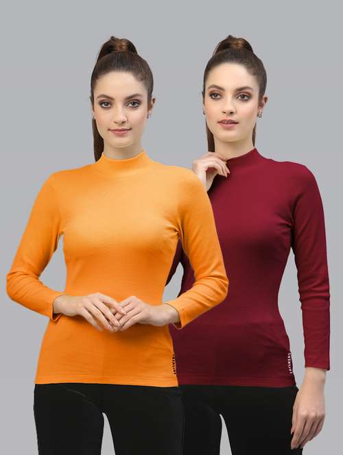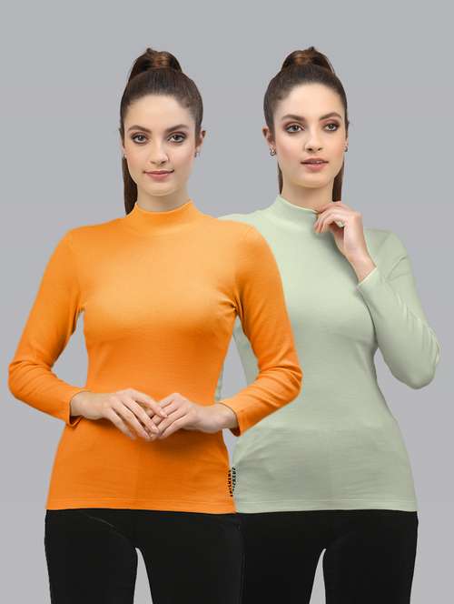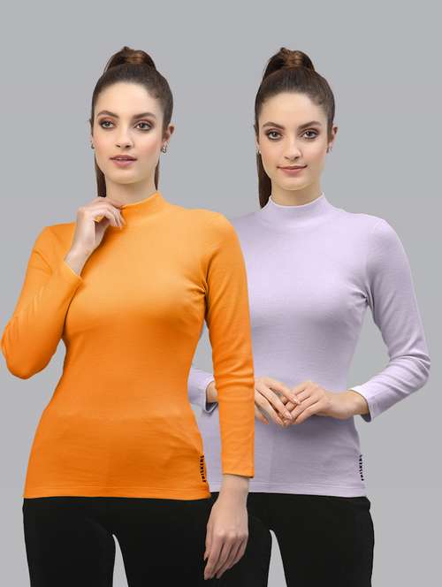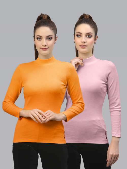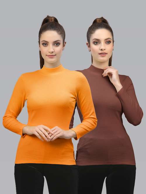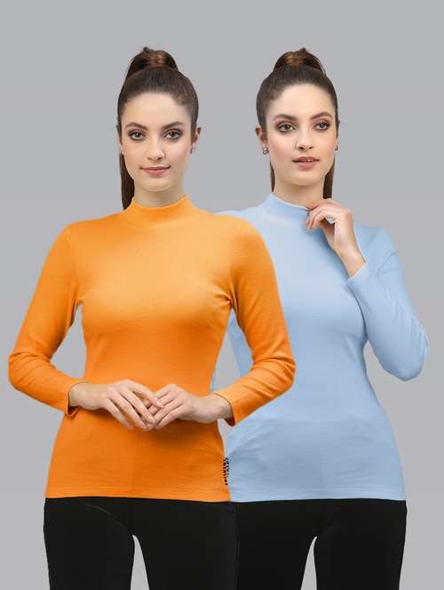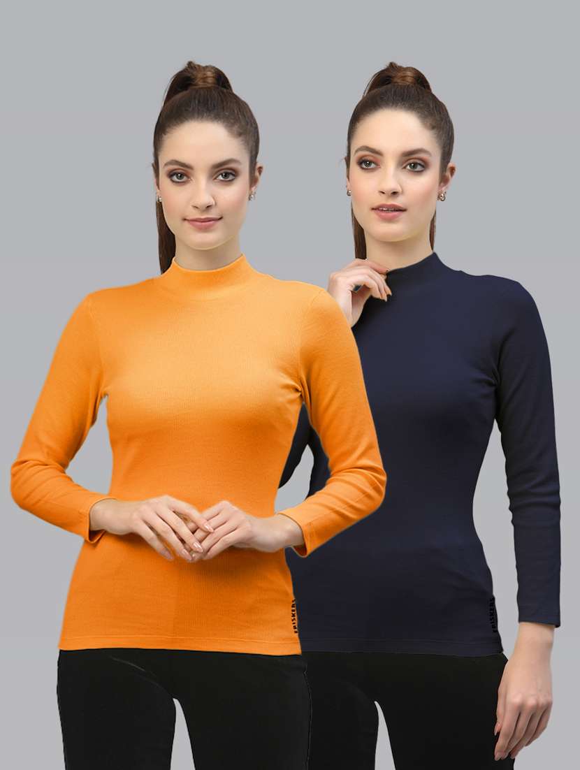 Orange Navy Blue Solid Casual Knitted cotton Rib Regular Length top for women direct manufectured by Friskers, Has a Turtle neck and Long sleeve.