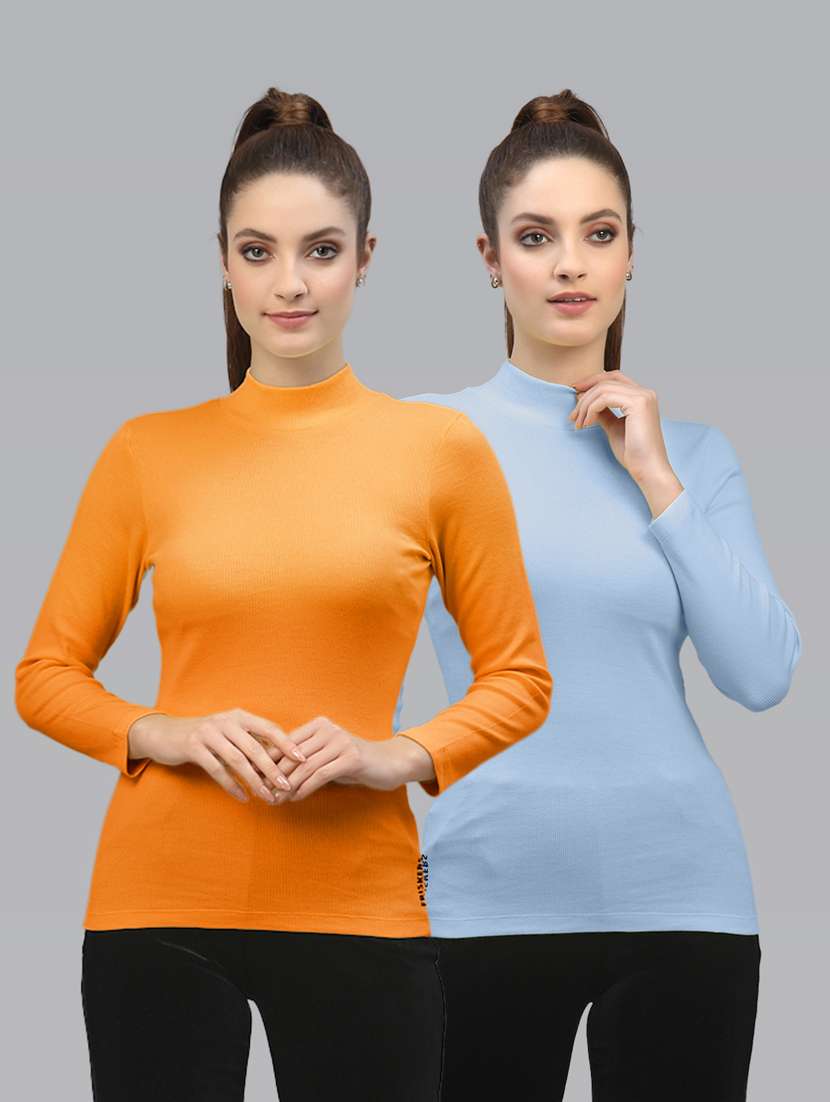 Orange Turquiose Solid Casual Knitted cotton Rib Regular Length top for women direct manufectured by Friskers, Has a Turtle neck and Long sleeve.